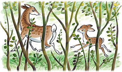 Видит: Оленуха в кустах со своими оленятами. И у Оленухи хвостик — маленький, пушистый, беленький хвостик. Муха как зажужжит: