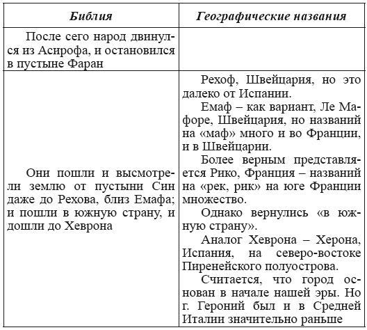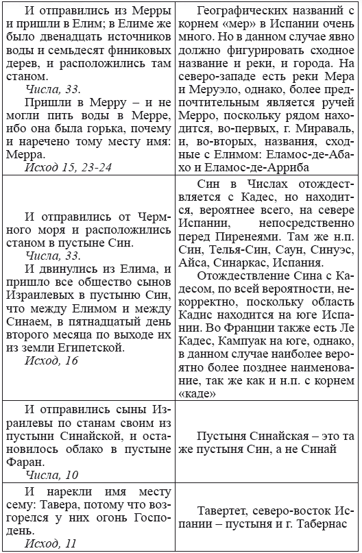 Действительно, в Западной Европе множество названий, сходных или однокоренных библейским. Учитывая же и возможность переводов этих названий именно на европейские языки, можно говорить о том, что в Библии фигурируют европейские названия, существовавшие в большинстве до прихода (возврата) туда евреев из Африки. Это, однако, создает сложности при определении пути передвижения евреев по Европе. Например, совокупные названия Масса и Мерива фигурируют в трех регионах Франции, а в материковой Италии есть несколько городов с библейским названием Сеттим. Поэтому мы искали наиболее рациональный непротиворечивый путь, но говорить о его стопроцентной точности мы не вправе.