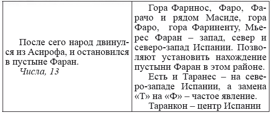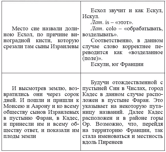 В Европе названий, сходных с библейскими, множество, и мы не претендуем на то, что обнаружили точные соответствия. Наиболее важно то, что фигурирующие в Библии названия имеют языковое сходство с европейскими. Так, библейское Венададу сходно названию племени венедов, а Идеал в Книге Навина даже не нуждается в переводе; Дивон в Библии, и Дивона – древний город кадурков в Аквитании (совр. Каор, Кагор) – юг Франции. При этом название, наиболее вероятно, восходит к diva – лат. «богиня». И далее знакомые нам по Руси Верея, по области Малой Азии Лидии – Лидда, имени древнего бога Тифона – Тефон, библейская Мариса и имя этрусского бога Марис (Марс). Посмотрите и имена потомков Ноя. Во-первых, это Гомер – имя, известное нам благодаря автору Одиссеи и Илиады, Иаван – Иван – самое распространенное славянское имя, Мадай – лат. madeo – «быть мокрым», Мадейра – область Португалии, исп. madera – «древесина», Сева – не только сокращенный вариант имени Всеволод, но и название славянских и испанских географических объектов, Дедам – лат. dedo – «отдавать», слав. «дед», известный художник Дедал и Дедалы – горная цепь и приморский город в Карии, на границе с Ликией. И таких совпадений множество, и все они требуют исследования и могут помочь не только в исследовании древнеевропейского языка, но и в восстановлении облика древней Западной Европы – определении местоположения и названий древних городов и стран.