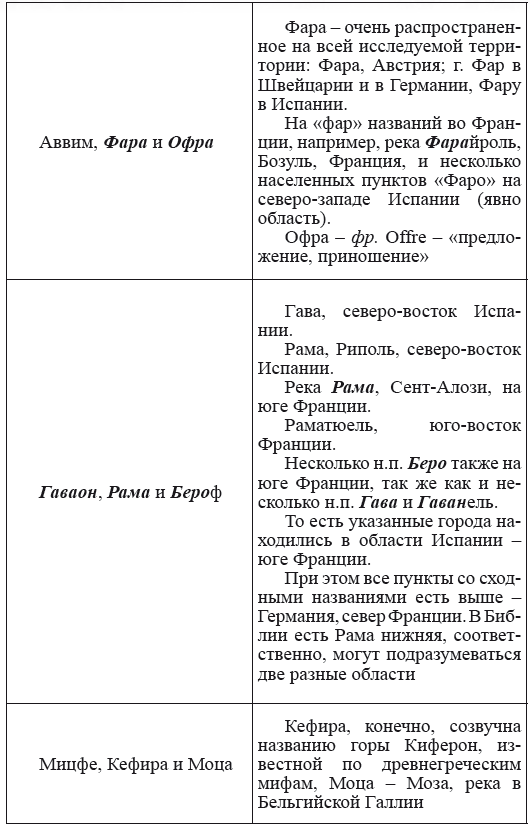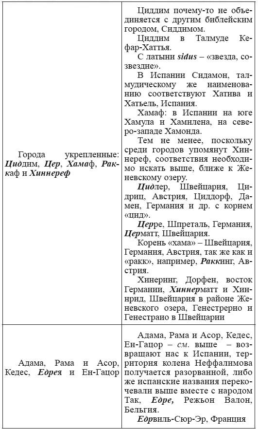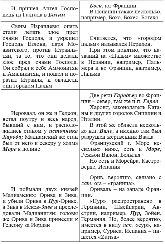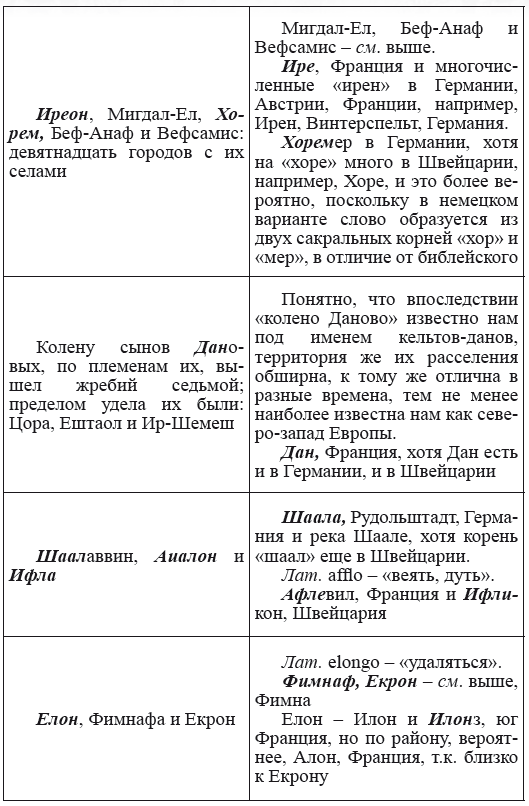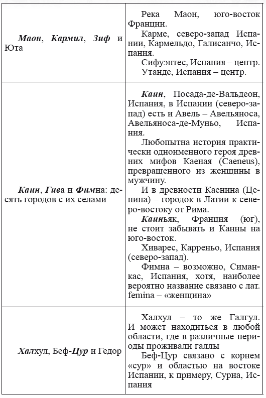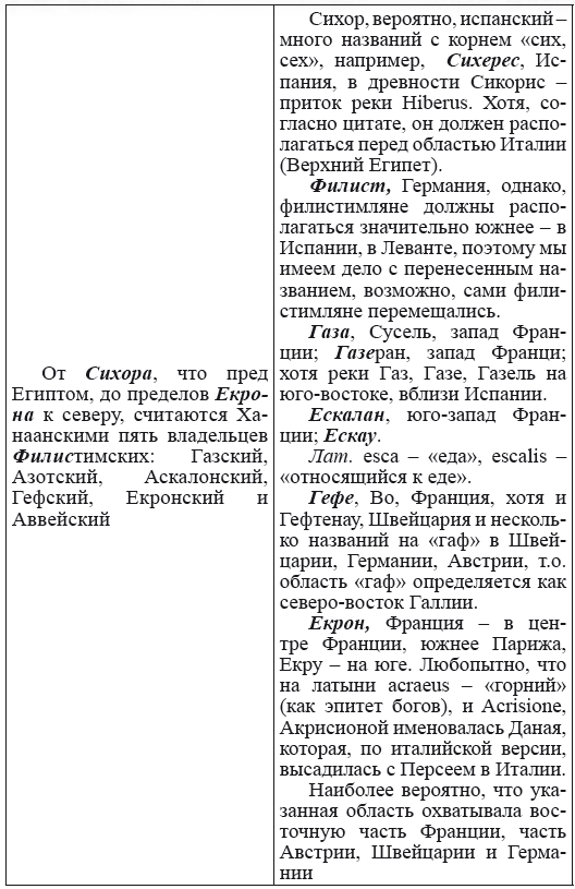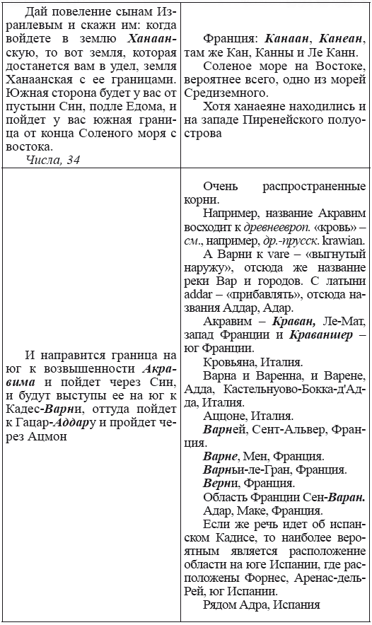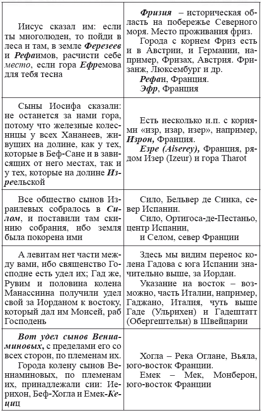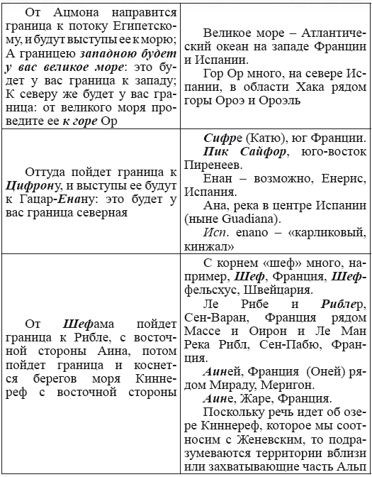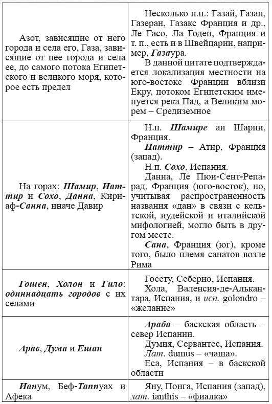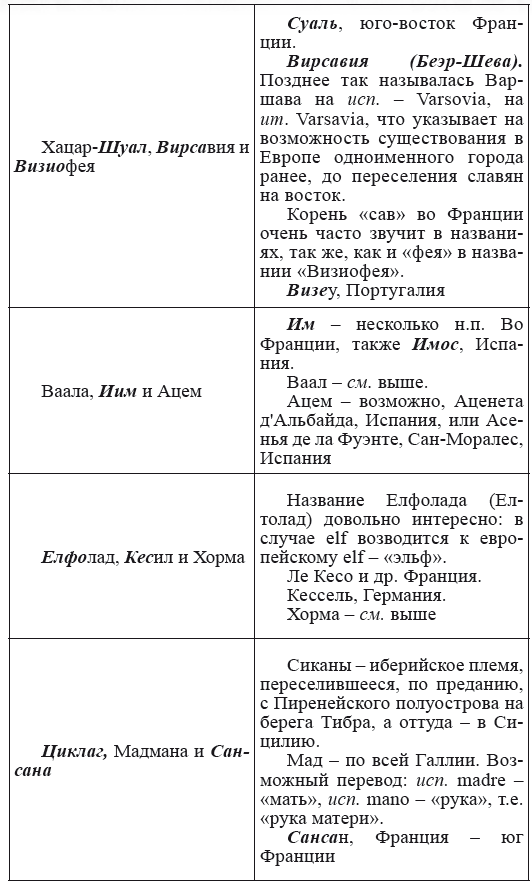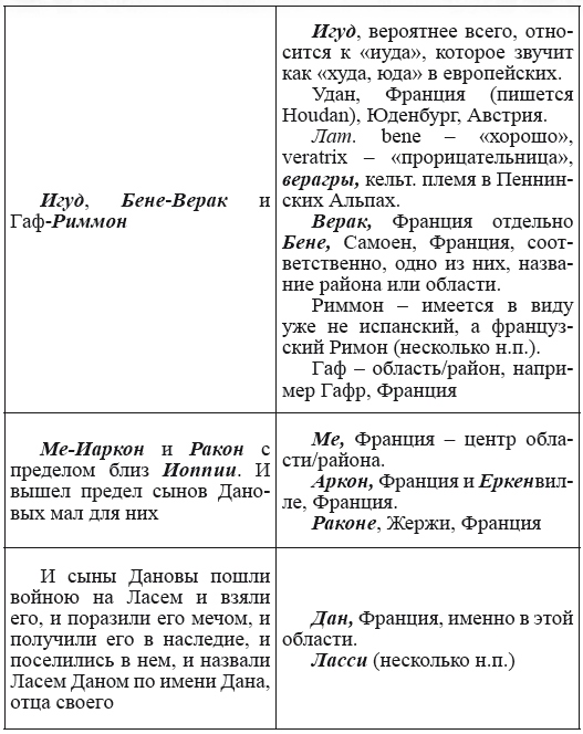При этом следует сразу сделать оговорку относительно текстов Бытия, описывающих более ранний период: учитывая «исход евреев» в Европу, связывать географические названия этого периода с названиями Бытия некорректно, поскольку описываемый в «Бытие» регион неизвестен. Большинство историков располагает его в Месопотамии. Хотя наличие таких названий, как Тир и Седон, прозвучавших в «Бытие», – Ла Тир (Уст) и Ле Седон (Орнезан) на одноименных реках, множества названий в Дании и Швейцарии, требуют разъяснений. В Дании есть названия Идум, Эдум, Мадим, Гаден, Леэ, Гиве, Фарре, Седа, Сир, Эрум, Хуне, Хаммет, Гассум, Хавбро, Хевринг, Хаврум, Хорв и др. Как мы видим, часть аналогична названиям Франции, Швейцарии, тем не менее сходство с ветхозаветными названиями или именами налицо.