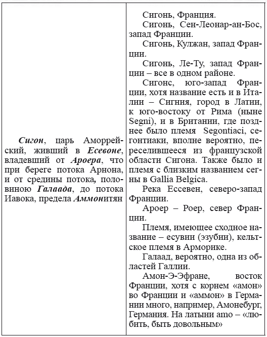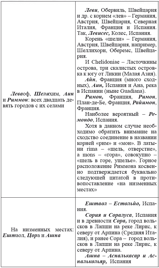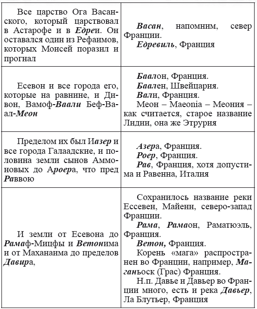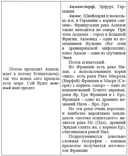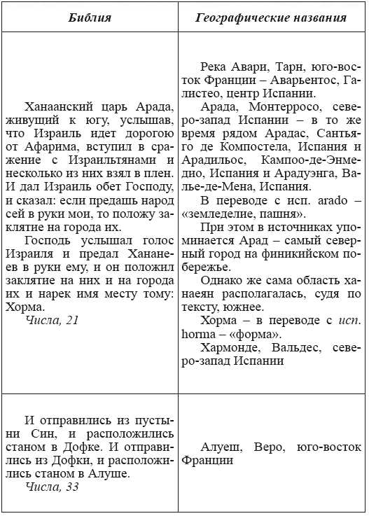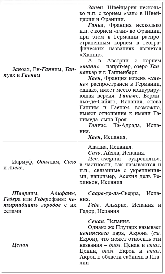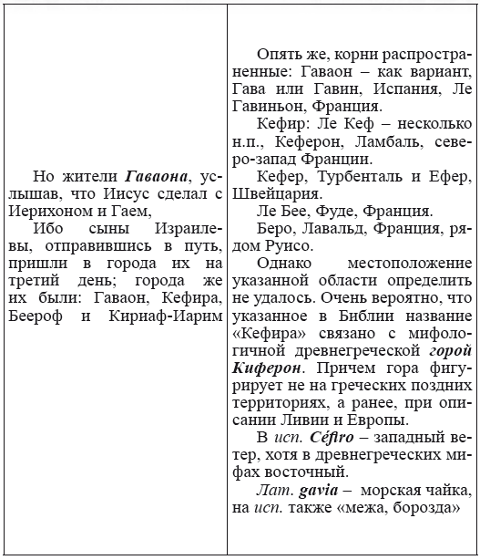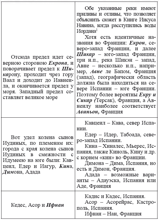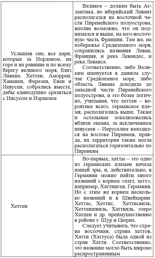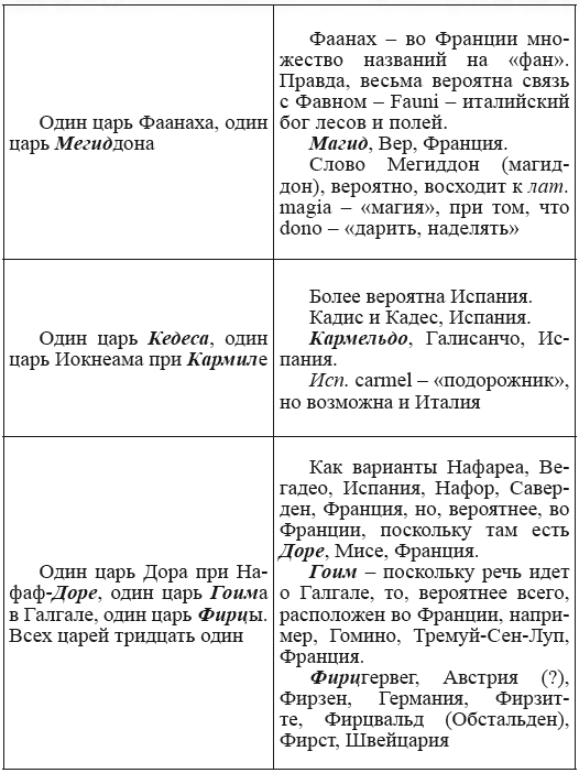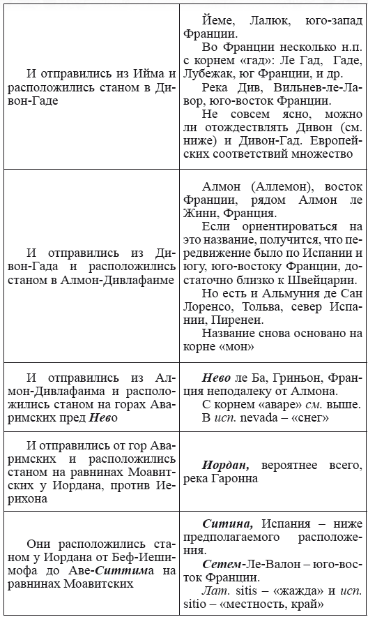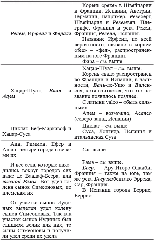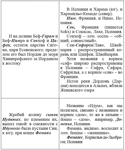 При этом следует сразу сделать оговорку относительно текстов Бытия, описывающих более ранний период: учитывая «исход евреев» в Европу, связывать географические названия этого периода с названиями Бытия некорректно, поскольку описываемый в «Бытие» регион неизвестен. Большинство историков располагает его в Месопотамии. Хотя наличие таких названий, как Тир и Седон, прозвучавших в «Бытие», – Ла Тир (Уст) и Ле Седон (Орнезан) на одноименных реках, множества названий в Дании и Швейцарии, требуют разъяснений. В Дании есть названия Идум, Эдум, Мадим, Гаден, Леэ, Гиве, Фарре, Седа, Сир, Эрум, Хуне, Хаммет, Гассум, Хавбро, Хевринг, Хаврум, Хорв и др. Как мы видим, часть аналогична названиям Франции, Швейцарии, тем не менее сходство с ветхозаветными названиями или именами налицо.