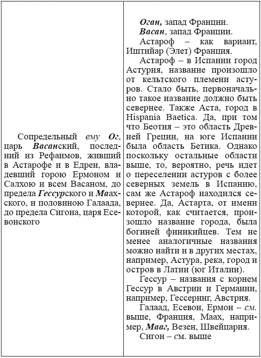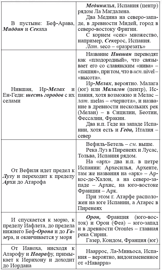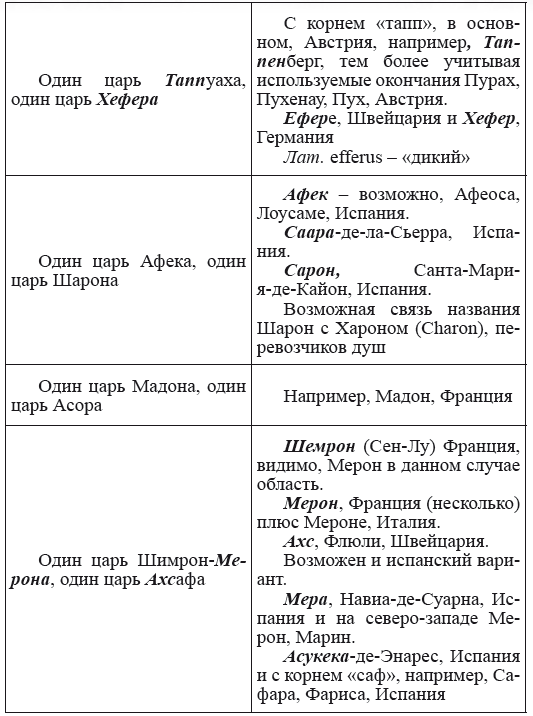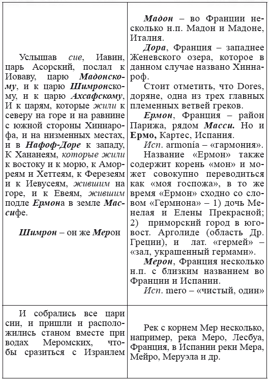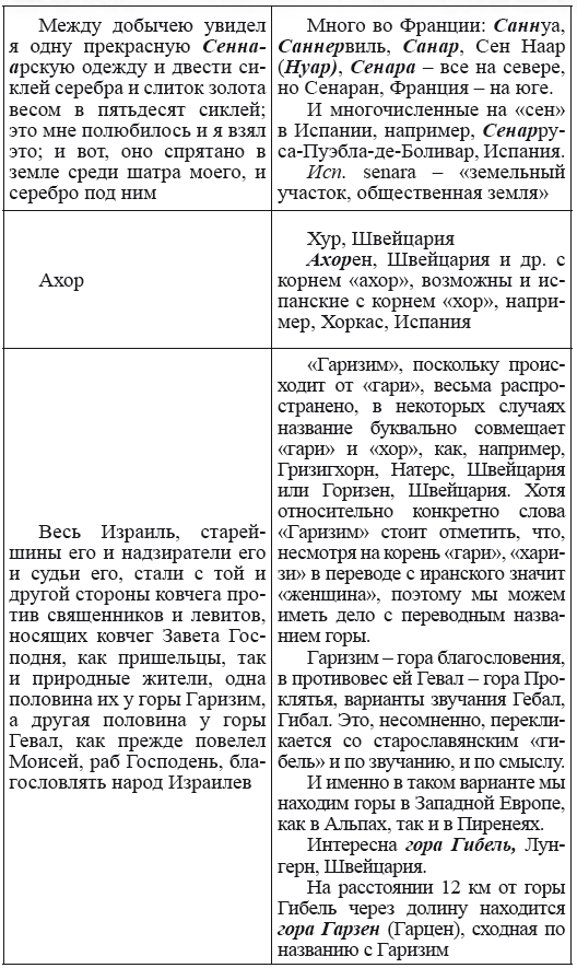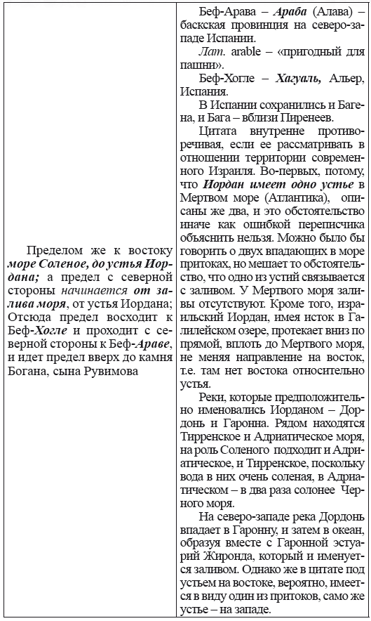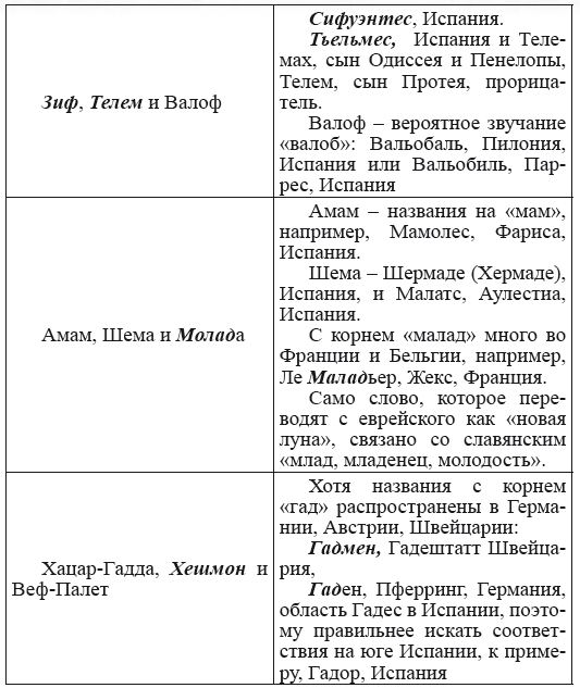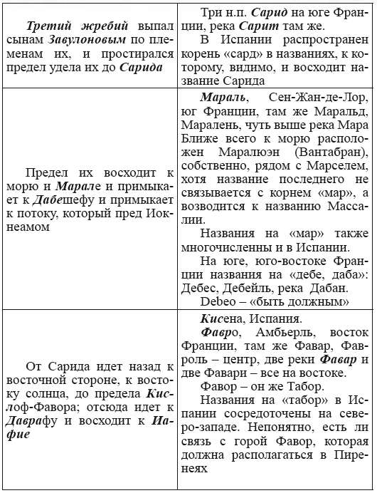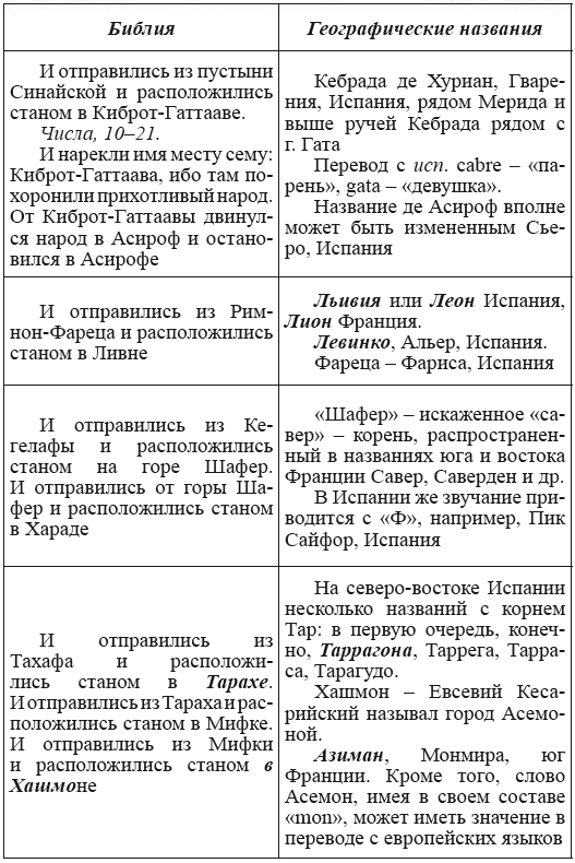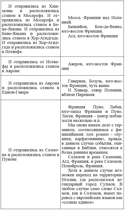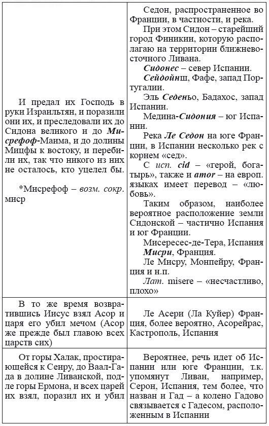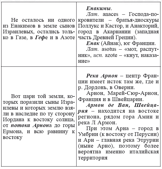При этом следует сразу сделать оговорку относительно текстов Бытия, описывающих более ранний период: учитывая «исход евреев» в Европу, связывать географические названия этого периода с названиями Бытия некорректно, поскольку описываемый в «Бытие» регион неизвестен. Большинство историков располагает его в Месопотамии. Хотя наличие таких названий, как Тир и Седон, прозвучавших в «Бытие», – Ла Тир (Уст) и Ле Седон (Орнезан) на одноименных реках, множества названий в Дании и Швейцарии, требуют разъяснений. В Дании есть названия Идум, Эдум, Мадим, Гаден, Леэ, Гиве, Фарре, Седа, Сир, Эрум, Хуне, Хаммет, Гассум, Хавбро, Хевринг, Хаврум, Хорв и др. Как мы видим, часть аналогична названиям Франции, Швейцарии, тем не менее сходство с ветхозаветными названиями или именами налицо.