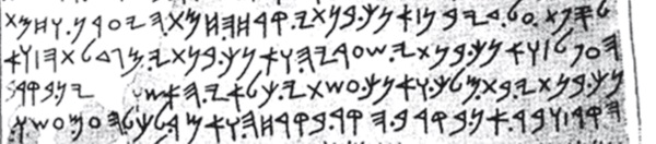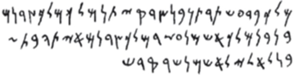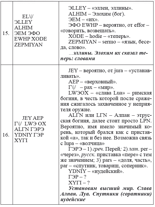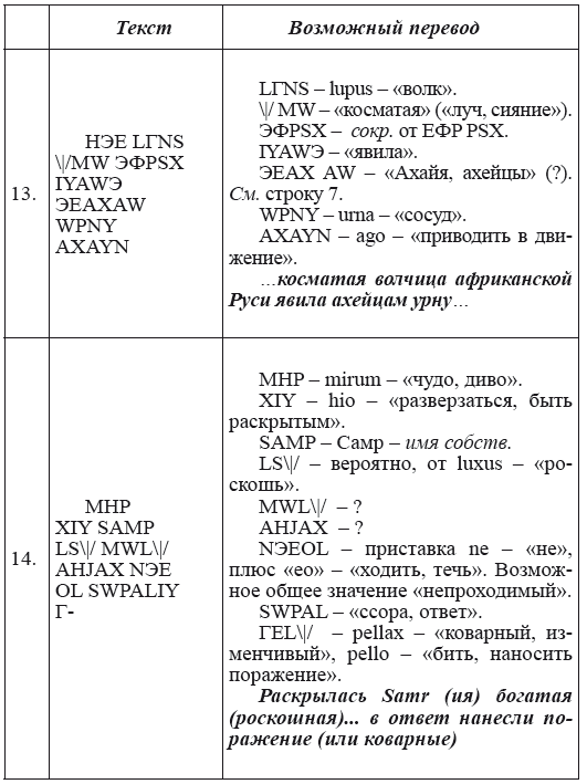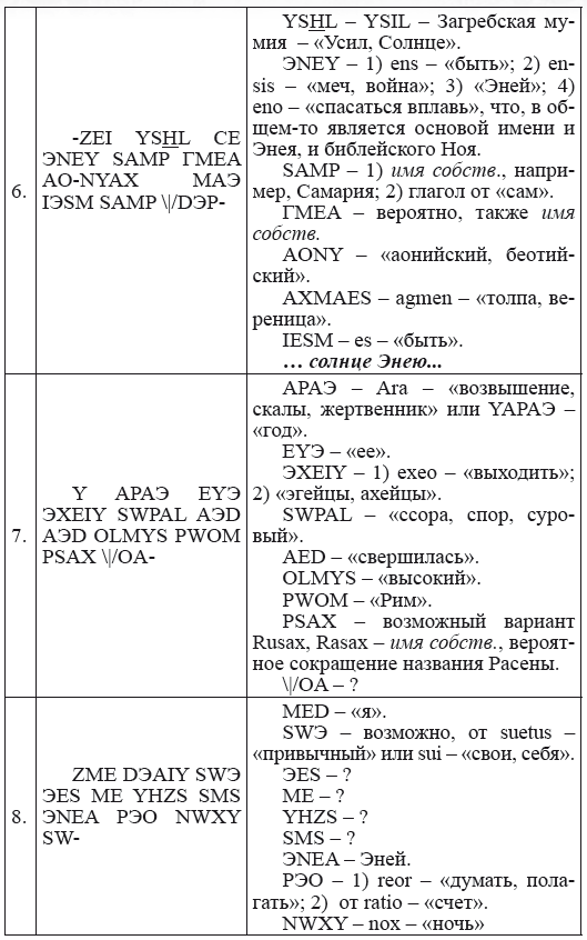 В данной надписи интересны слова ЭXIJ – от «эхейцы», ФIYЗ – родственное греч. «Феус» и лат. deus – «бог», ГSIAL – греч. рsychikos – «душевный», ГAXI – лат. pax – «мир, покой», а также склонения слова lux – «свет»: L\|/, L\|/IЗ и L\|/YWS, читаемое как «Люксиус-Люциус».