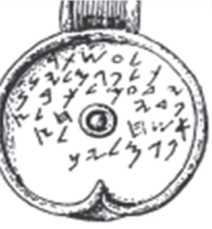Золотой кулон. Карфаген. Датируется VIII в. до н. э. Считается, что на нем надпись-посвящение Ядамилку, сыну Падаи. Однако же первым словом мы видим LOWXP (справа-налево), которое читается как Луксор.