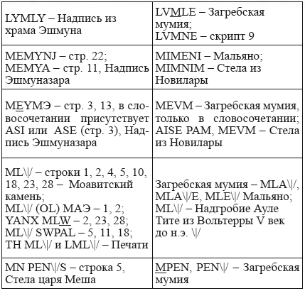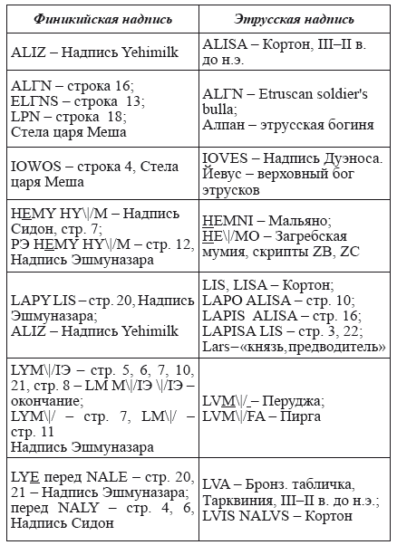 Также можно обнаружить совпадение слов в «финикийских» и этрусских надписях. Приведем несколько сравнений из словаря: [44]