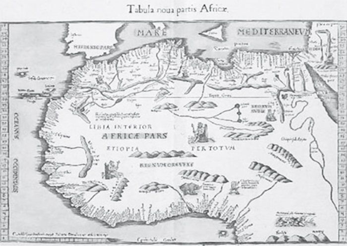 Африканские названия отчасти не обошла участь библейских – они тоже переносились и переименовывались. Так, Эфиопия, упоминаемая и в Библии, и Иосифом Флавием, и другими древними историками, плотно связана с историей древнего народа евреев. И сейчас, как известно, она расположена на северо-востоке Африки, непосредственно у современного Красного моря. Но на древних картах она указана в другом месте, а именно – на северо-западе, как на этой карте, или в центральной части прямо под Ливией.