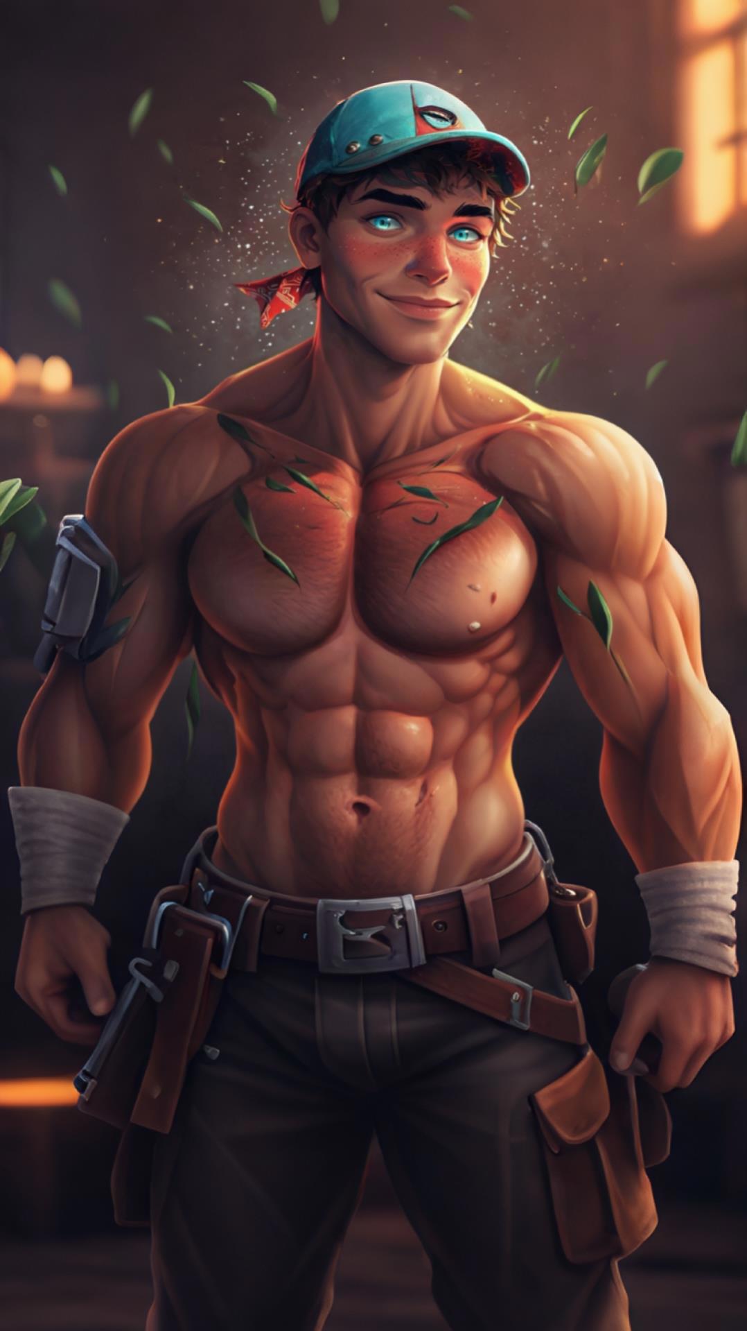 За барной стойкой стоял парень, который явно отличался от местных пьяниц. Лет двадцати, мускулистый и загорелый, на голове у него была синяя кепка, под которой виднелась красная бандана. Его торс был оголен, а широкие, укороченные белые бриджи придавали ему вид настоящего морского волка. Когда он заметил девушку, его лицо стало серьёзнее.