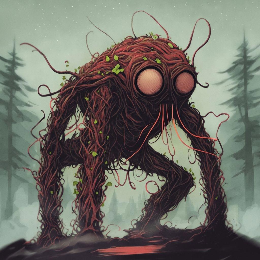 Перед ними, прямо из тянущихся лиан, начало формироваться нечто жуткое. Существо, похожее на узловатый древесный нарост, обросло шипами и извивающимися щупальцами. В самом его центре тускло мерцала красная сердцевина, придавая существу угрожающий, зловещий вид. Оно, казалось, собиралось из лиан на глазах, медленно сливаясь с лесом и словно оживая только для того, чтобы броситься на них.