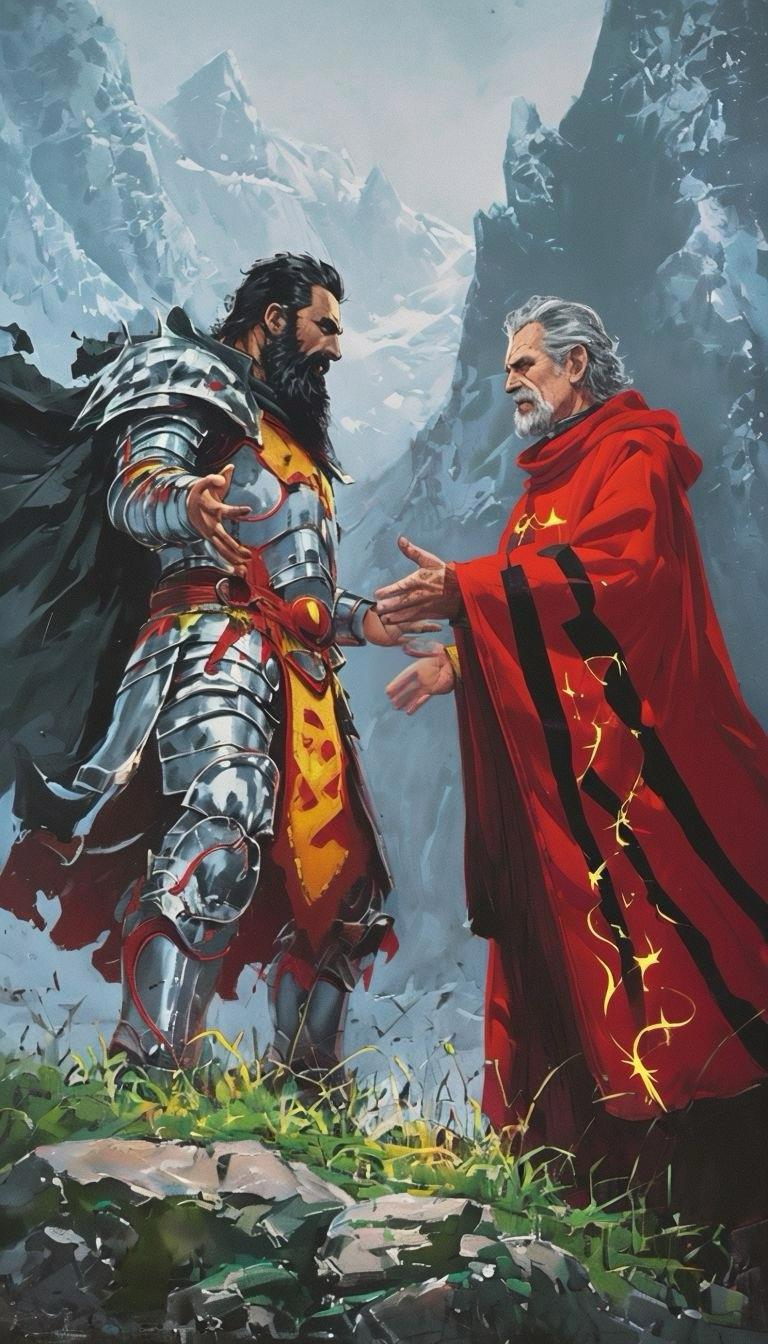 Ему противостоял мужчина в пыльных доспехах, с густой бородой, которая скрывала половину лица. Его голос звучал тише, но его хриплый тон был наполнен раздражением и сталью. Он держал шлем в одной руке, а другой жестикулировал, словно пытаясь объяснить очевидное.