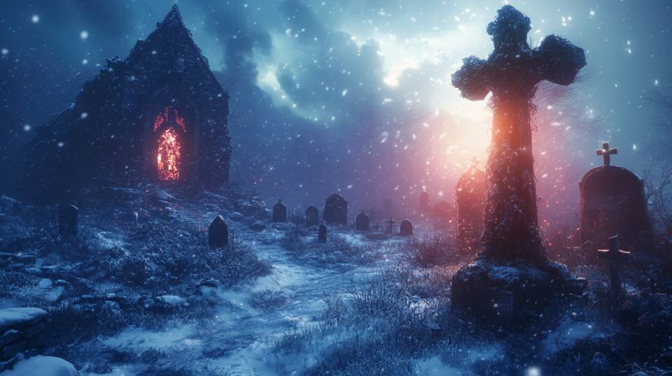 С шумом вылетает деревянная дверь склепа. Она проваливается внутрь, но девушка резко подаётся вперёд, и вырывает её прочь.