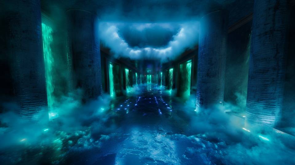 Пройдя коридор с клинками и отключив ловушку в следующей локации правом аудитора, мы вышли в длинный и весьма своеобразный тоннель. Это было что-то вроде вечного душа. Тёплые капли падали с потолка, а на кафельном полу была тёплая вода где-то по щиколотку.