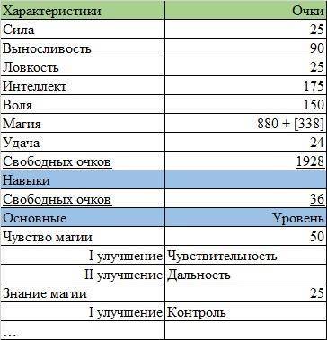 Ещё двести пятьдесят очков вложу в «Волю», чтобы довести показатель до минимальных значений, требуемых для второго круга призыва сущностей. И сверху ещё двести очков, для острастки. И в «Выносливость» двести очков, чтобы в параметрах «жизни» и «выносливости» было не меньше шести тысяч пунктов — это так же пригодится для призывов «второго круга тн’аба». Но остальные-то очки куда девать? Хотя, вопрос с «очками характеристик» не самый важный.