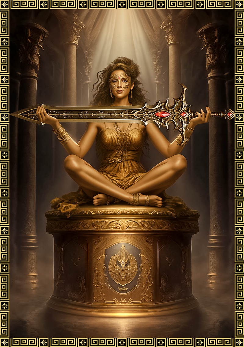 Смеющаяся сидела в позе лотоса. С прекрасного обнажённого плеча ниспадали складки туники. Лицо скрыто полумаской, рот искривлён в вечной усмешке. Статуя выглядела, как живая. В обнаженных руках Богиня сжимала меч.