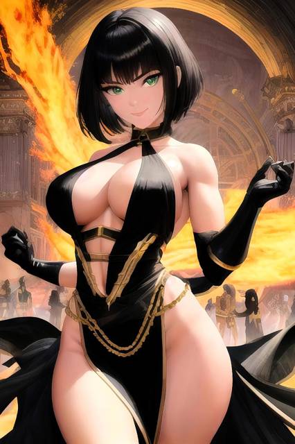 В целом — фигурка у девушки бомбовая. Пышная грудь, осиная талия и сочные бедра. Разглядеть мне удалось все изгибы ее тела, потому как на ней было надето открытое платье, если эти лоскуты черной ткани вообще можно было так назвать. Разрезы по бокам начинались от самой талии и оголяли ее округлые бедра, на которые игриво свисали золотые цепи. От талии тянулись два лоскута ткани, закрывающие лишь пару самых интересных сантиметров на груди красотки. Крепились лоскуты на кожаный ошейник на шее.