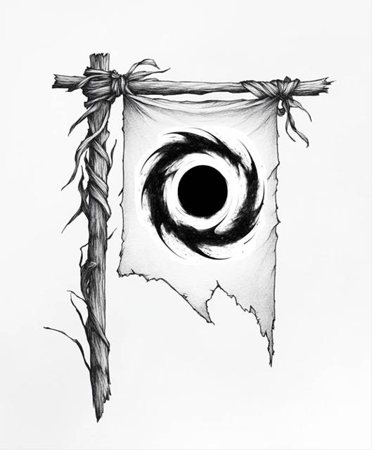 По ровной скалистой поверхности открытого пространства перед крепостью шла одинокая фигура молодого мускулистого парня. За его спиной висело два огромных меча и виднелось древко косы. В руках же он нёс штандарт с изображенным на нём неизвестным символом, выглядящим как чёрный провал с кружащими вокруг него абстракциями.