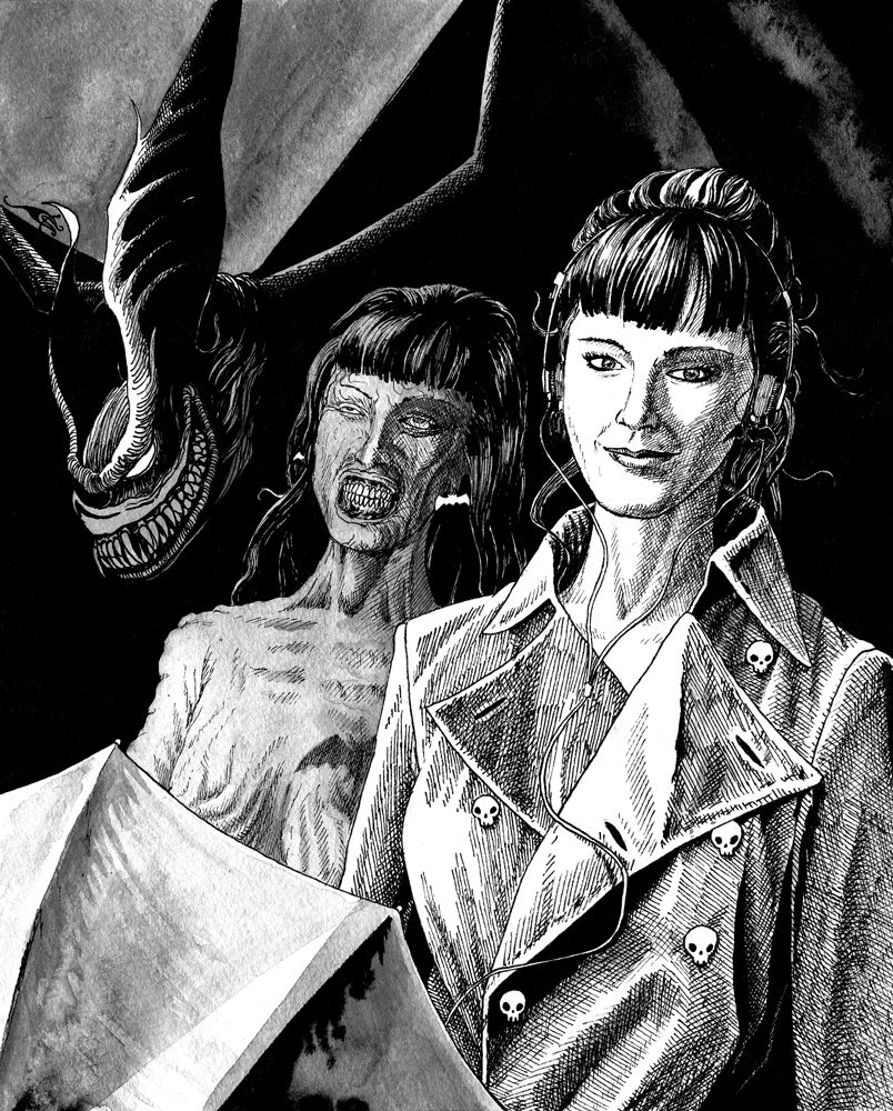А потом в кафешечные двери вломилась Эми с плейером Walkman, в мини-плащике: последний раз Прентис видел такой короткий дождевик в 1968-м. Тонкая, изящная, и во всех повадках сквозил аристократизм, который макияжем было не приглушить. В те дни у неё были волосы цвета кедра, так высоко подколотые, что открывались длинная шея и затылок. В мочки ушей продеты ониксовые серёжки — летучие мыши.