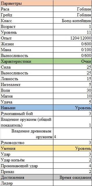 У гоблина ситуация примерно похожая. Одиннадцать уровней — это пятьдесят пять свободных очков умений. Он их раскидал между «Силой», «Выносливостью», «Ловкостью» и пятёрку в «Магию» закинул. Ещё пять очков в каждую характеристику добавилось, когда гоблин эволюционировал из гоблятора, а повышенная «Воля», скорее всего, от достижения «Лидер». Налдас как-то говорил, что выводок на новом месте первым делом всегда прокачивает двух гобляторов до десятого уровня, чтобы первый стал гоблином, а второй маткой. С навыками и умениями всё, как и у гоблятора — ничего не понятно, но предположения имеются.