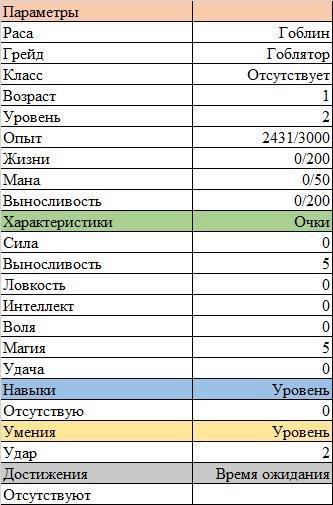 У последнего гоблятора второй уровень, это десять свободных очков характеристик, и он их вложил в «Выносливость» и «Магию». А навыка нет, потому что либо нужного количества не скопил, либо условия не выполнил для получения. Тот же навык «Кулинария» получить просто, достаточно много готовить всякого-разного. Но ситуация с «Ударом» непонятна. Почему оно обошлось гоблятору бесплатно, когда как драконам и высшим разумным на обучение надо тратить очки умений?