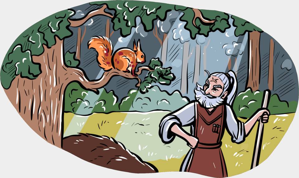 От удивления я даже заговорил беличьим голосом. Пока я сосредоточённо разглядывал убитого медведя, старик вернулся к дереву и встал напротив моей ветки. Теперь стоит и разглядывает меня. И этот его пристальный взгляд до жути пугает.