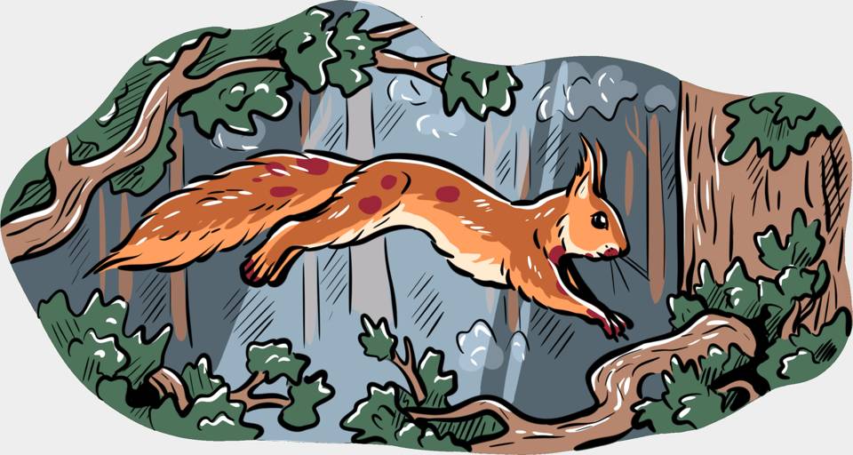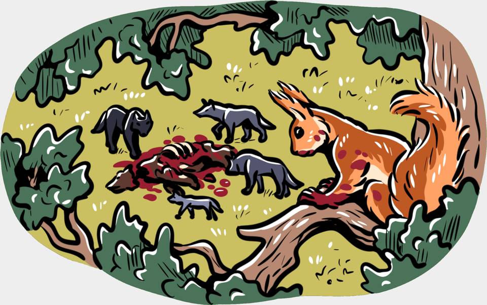 Кстати, надо бы вернуться и набить брюхо вкуснейшим лесным деликатесом. Да и когда ещё у белки появится возможность насладиться медвежатиной?
