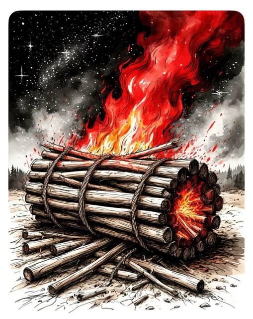 Шуметь непосредственно возле расположения врага нельзя. Так что — дров не нарубишь. Гномы по указанию Зобгина наломали руками толстых сучьев, он связал их в большую вязанку, для чего частично распустил свой свитер-исподнее. Связаны дрова были хитро, так, чтобы между ветками было пространство, для чего они были проложены поперечными ветками потоньше.