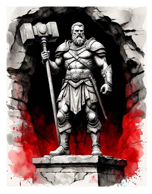 Это был ход в просторную, естественную пещеру, явно не тронутую киркой гнома. В центре её, на небольшом естественном возвышении, стояла статуя. Древняя, высеченная из цельного куска какого-то тёмного, почти чёрного камня, она изображала коренастого воина в полном боевом облачении, с огромным двуручным молотом в руках. Лицо его было суровым, но исполненным какой-то внутренней силы и мудрости. Величественная, даже в своем нынешнем состоянии, статуя излучала ауру древности и могущества.