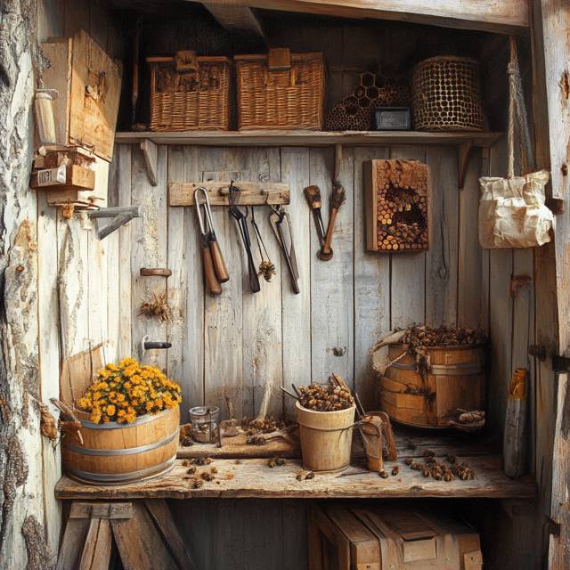 Мы довольно быстро открыли дверь, пришлось сломать крепёж засова, но для меня такая потеря непринципиальная. Быстрее вхожу и от удовольствия потираю руки. Всё что надо для бортничества есть. И даже шляпа с сеткой, прям как в нашем мире. Пресс для отжима, что замечательно — винтовой, с ним даже я справлюсь. Дымарь, ножи, стамеска, тут и запасы старого воска, и вощина, и…