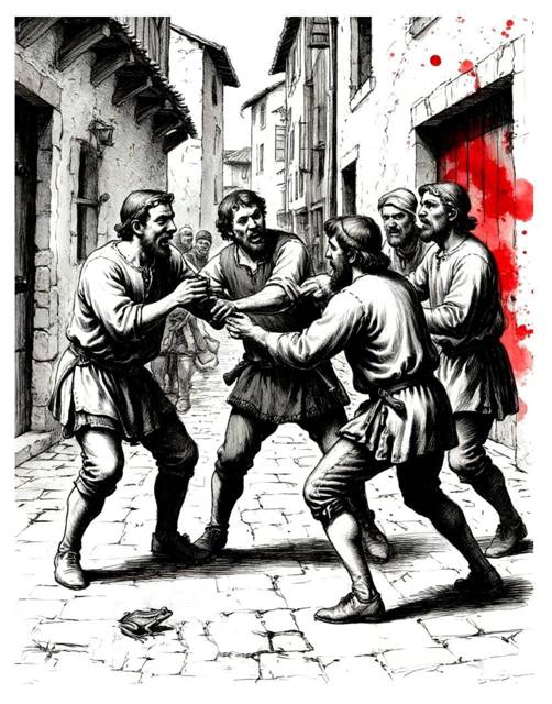 Драка, нарастая в громкости и ожесточении, медленно смещалась прямо ко входу в тюрьму. Стражники сначала наблюдали за этим с ленивым любопытством. Для них это было бесплатное развлечение, вносящее разнообразие в их унылую службу.