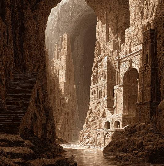 Напоминает следы затерянной цивилизации, но скорее всего это что-то эльфийское, раз уж пустыня взята из их мира. По обеим сторонам подземной реки прямо в скалах вырезаны целые дворцы с башнями, многочисленными лестницами и арками. Всё кажется древним, но при этом не думает разваливаться. В подземном городе нет жителей, только тишина и полумрак альковов.