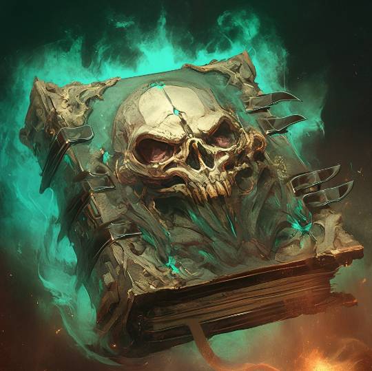 С распахнутыми от удивления глазами беру в руки толстенный фолиант с выступающим черепом на обложке, которая на ощупь выполнена из чье-то толстой и грубой кожи. Череп как будто пытается высвободиться из гримуара, раздвигая складки кожи. Вокруг книги вижу зеленоватую ауру, а корешок и уголки закрыты металлическими полосами.