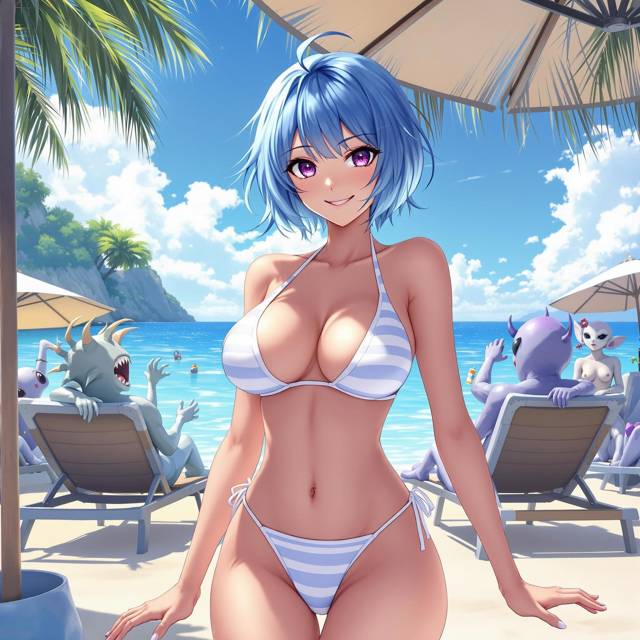 Потом, беззвучно ступая по песку, появилась Вайлет. Короткие синие волосы слегка взъерошились, а в фиолетовых глаза пылали непривычные искорки задора. Её бело-синее, полосатое бикини контрастировало со слегка загорелой кожей… Так, стоп.