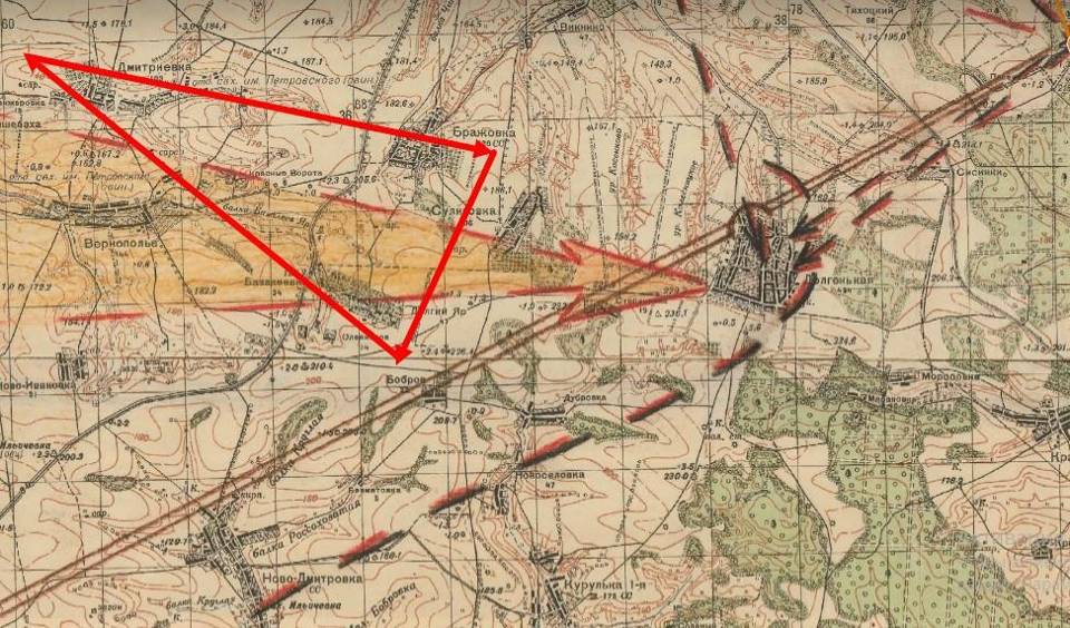 Такое место нашли, заодно поменяв вектор наступления и повернув на север, так как из штаба армии пришёл приказ военного совета Южного фронта. Соединиться с 5-м кавалерийским корпусом и уничтожить войска противника. Корпус следовало искать в районе Базалеевка, Бражовка. Кавкорпус мы в районе Базалеевки не нашли, но войска противника, которые нам попадались, уничтожали. В результате пришлось остановиться и занять круговую оборону двумя дивизиями в треугольнике Дмитриевка, Базалеевка, Бражовка, в ожидании войск своей армии или кавалерийского корпуса, который воевал здесь ещё вчера. Подошёл только полк из 14-й гвардейской дивизии, который оставался в районе Барвенково. Так как связь со штабом армии неожиданно прервалась, а последний приказ мы выполнили, то пришлось оставаться на месте и контролировать узел дорог, проходящих в разных направлениях через наш район обороны. Противник с этим категорически не смирился, и наносил короткие удары пехотой и танками со всех сторон. Но шесть стрелковых полков, под прикрытием четырёх артиллерийских, не дали ему шансов даже на малейший успех. Зенитное прикрытие в дивизиях было слабовато, поэтому авиация немцев доставила нам много неприятных моментов, но за это мы отомстили сухопутным войскам.