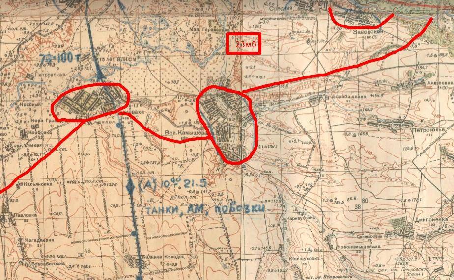 Никаких сведений о противнике кроме того, что он перешёл в наступление и прорвал оборону Южного фронта, захватив Барвенково, мы не получили. Поэтому, добравшись до реки Берека, пришлось действовать осторожно и выслать разведку в направлении Барвенково а так же Большой Андреевки. Командиру 23-й мотострелковой бригады я приказал переправиться через реку и занять рубеж обороны, оборудовав батальонные узлы сопротивления в населённых пунктах Грушеваха и Великая Камышеваха. Третий мотострелковый батальон, усиленный спецподразделениями бригады, должен был занять оборону от Великой Камышевахи до посёлка Заводской, расположенного на южном берегу Северского Донца. Шесть километров многовато для одного батальона, но с фронта его прикрывал глубокий овраг и речка Великая Камышеваха. Да и одной пассивной обороной я ограничиваться не собирался, а планировал перекрыть обе дороги, идущие с востока, вдоль южного берега Северского Донца, выдвинув в том направлении 130-ю танковую бригаду. Канонада от разрывов бомб и снарядов слышалась как на юге, так и на востоке от нас. Поэтому, где искать противника, можно было догадаться, не получая указаний от главнокомандования.