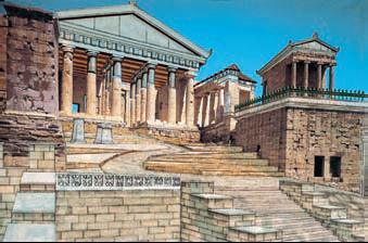 Пропилеи (архитектор Мнесикл) и храм Ники Аптерос (архитектор Калликрат; 442-20 до н. э.) на афинском Акрополе. Реконструкция