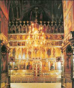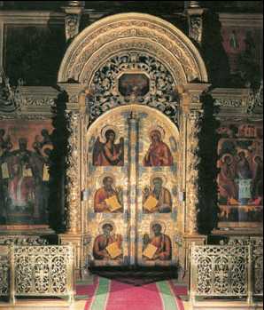 ИКОНОСТAС (от греч. eiko?n – изображение, образ и stasis – место стояния), в православном храме преграда в виде стены с расположенными в определённом порядке рядами икон, отделяющая алтарь от помещения для молящихся. Иконостас возник из алтарной преграды, которая существовала уже в раннехристианских постройках. Она представляла собой невысокую мраморную балюстраду в виде колонного портика, в центре которого находился проход в алтарь. В Византии существовал тип алтарной преграды, называемый темплоном; его украшали орнаментами и изображениями крестов, фигурами святых. Самые ранние из сохранившихся иконописных изображений, помещавшихся на темплоне, относятся к 11 в. С увеличением размера и числа икон темплон постепенно терял самостоятельное значение, становясь своего рода «подставкой» для живописных образов.