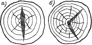 Метик (рис. 25) – радиальные трещины внутри дерева, образовавшиеся от его раскачивания и незаметные снаружи. Чаще встречается у старых деревьев и идет на значительную длину. В распиловку такие бревна не годятся, особенно если трещины идут от центра под углом (метик несогласный).
