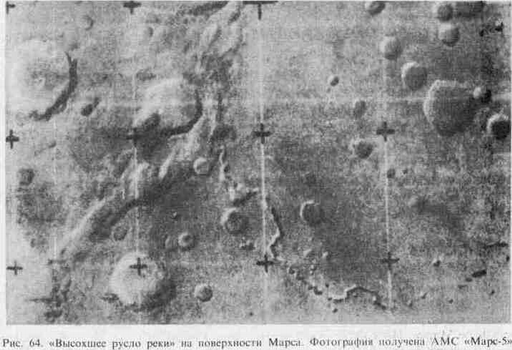 На рис. 64 приведена фотография участка Марса, полученная советской АМС «Марс-5». На ней отчетливо видна извивающаяся линия, очень похожая на русло реки. Такие образования найдены на Марсе в значительном количестве. Характерная структура, форма, наличие «притоков», «наносов» и т. д., — все указывает на то, что мы имеем здесь дело с настоящими сухими руслами. Трудно оценить их возраст, скорее всего, он достигает многих сотен миллионов лет и даже миллиардов лет. Наличие «сухих русел» является аргументом в пользу того, что на Марсе в прошлые геологические эпохи была более плотная атмосфера и более мягкий климат, пригодный даже для земных форм жизни.