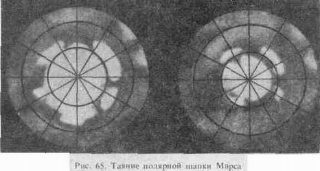 Когда в каком-нибудь из полушарий Марса наступает весна, полярная шапка начинает довольно быстро уменьшаться в размерах (рис. 65). На ее краях появляется темная кайма шириной в несколько сотен километров. Волна «потемнения» распространяется в сторону более низких марсианских широт. При этом отдельные детали морей заметно темнеют. С наступлением осени волна потемнения начинает перемещаться в обратном направлении. На первый взгляд естественно связать описанные только что сезонные изменения деталей на поверхности Марса с увлажнением его почвы.