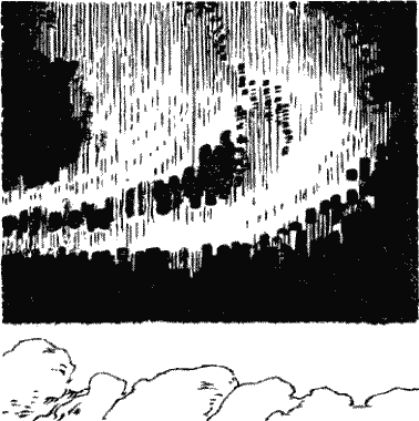 По всему небу внезапно вспыхнула волнистая завеса, переливаясь изумрудным и рубиновым светом. Звезды и луна померкли.
