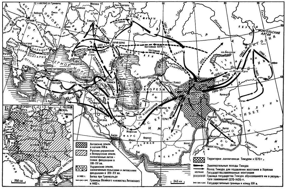 Тимур по дороге на запад взял и разрушил пограничный город Елец. Был ли Елец тем самым «русским городом Карасу», где укрылся Бек-Ярык-оглан, — неясно. [1158] Но интересно то, что Шереф ад-Дин Йезди и Низам ад-Дин Шами повествуют о походе Тимура на Машкав, т. е. на Москву, [1159] которого не было. Тем не менее описание побед над «эмирами русскими… вне города» и перечисление захваченной добычи весьма подробно: «рудное золото и чистое серебро, затмевавшее лунный свет, и холст, и антиохийские домотканые ткани… блестящие бобры, несметное число черных соболей, горностаев… меха рыси… блестящие белки и красные, как рубин, лисицы, равно как и жеребцы, еще не видавшие подков. Кроме всего этого еще много других сокровищ, от счета которых утомляется ум». [1160]