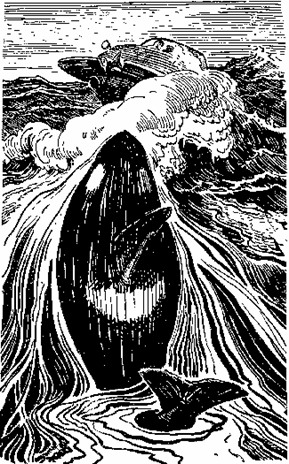 Слушая диалог между Лагранжем и Костей, я с минуту перестал наблюдать за морем и когда бросил взгляд на побелевшие валы, то увидел огромное тело косатки, скользившее в пене в каких-нибудь ста метрах. Сразу бросался в глаза очень темный цвет ее кожи, почти черный.