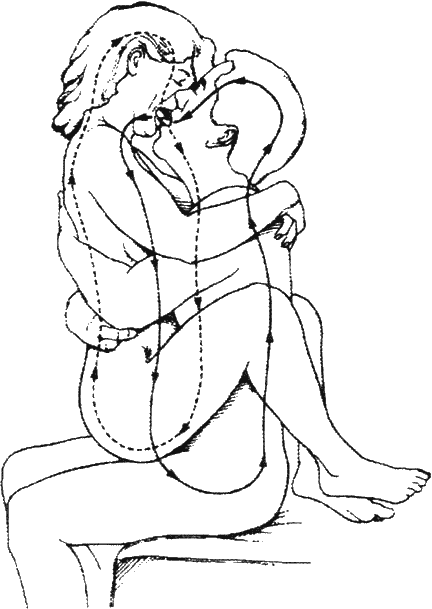 Первое время может показаться, что энергия настолько взрывная, что вам будет сложно различить, где ваша энергия, а где энергия вашей партнерши. Однако в конце концов вы сможете отличить прохладную Инь-энергию партнерши от своей горячей Ян-энергии. Если партнерша не знает, как перемещать свою энергию, вы можете помочь ей, посылая ей энергию через пенис во влагалище, помогая ей поднять поток энергии вдоль позвоночника к макушке, затем опуская к языку и далее вниз по передней части ее тела к влагалищу.