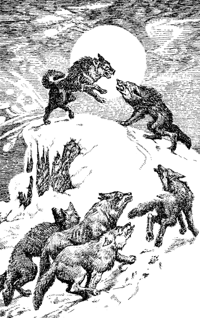 Второй раз за эту ночь Мики не бросился убегать, а застыл в ожидании на вершине скалы, венчавшей небольшой холм. Она была такой узкой, что рядом с ним лишь с трудом могла бы уместиться другая собака. Внизу во все стороны простиралась снежная равнина, призрачно-белая в свете луны и звезд. Мики почувствовал неодолимое желание ответить своим диким родичам. Он задрал морду так, что его черный нос указывал прямо на Полярную звезду, и из его горла вырвался протяжный вой. Однако вой этот был очень тихим, потому что, несмотря даже на гнетущее ощущение одиночества, Мики помнил про осторожность и не хотел выдавать своего присутствия. Больше он не издал ни звука, а когда волки приблизились, все его тело напряглось, мышцы вздулись буграми, а в горле заклокотало еле слышное рычание, совсем не похожее на призывный клич. Он почувствовал, что приближается опасность. В волчьих голосах он уловил то злобное безумие, которое заставило Пьерро перекреститься и пробормотать молитву против волков-оборотней. Мики же молиться не стал, а только распластался на камне.