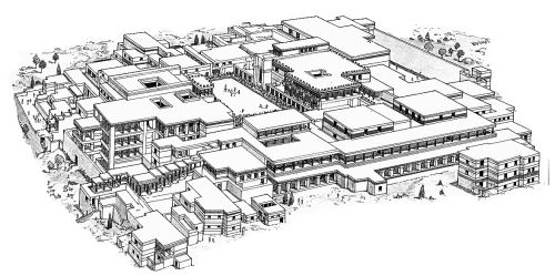 После долгих лет раскопок и кропотливой реконструкции археологи сумели восстановить образ стройного архитектурного ансамбля. Вокруг просторного, двора размером 5050 метров, вымощенного камнем были выстроены самые разнообразные сооружения. Этажи дворца опирались на колонны и соединялись между собой монументальными лестницами. Сотни залов и комнат предназначались для торжественных приемов, служили покоями для царя и царицы, сановников и придворных дам, слуг и невольников. Здесь же располагались и просторные мастерские царских ремесленников.