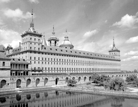 Называемый в Испании восьмым чудом света Эскориал скорее похож на крепость. Он раскинулся обширным прямоугольником (размер внешних стен 161206 метров), и его безыскусные, по-военному строгие и симметричные фасады могут показаться однообразными. Они раскинулись так широко, что их невозможно охватить взглядом, и они кажутся бесконечными. Впечатление это усиливается тем, что их гладкие стены, лишенные почти всяких украшений, сливаются в общую массу. Единственным их украшением являются лишь традиционные для испанской архитектуры угловые башни.