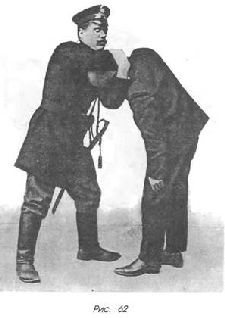 Схватить арестуемого за голову так, чтобы ваша правая рука обхватывала его голову с правой стороны за подбородок, а ваша левая рука, приходясь вплотную своей верхней частью к левой стороне его лица, крепко сжимала бы через его голову запястье вашей правой руки (рис. 62).