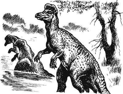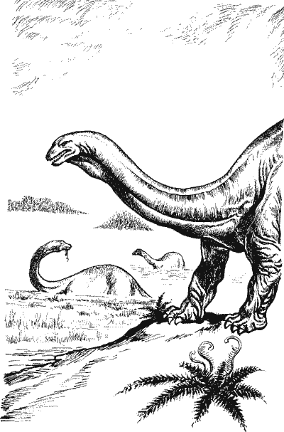 Бронтозавры медленно и грузно двигались вдоль берега, выставляя над водой лишь верх спины и время от времени голову. Бронтозавры обитали на глубине всего в четыре-пять метров, но и сюда не решались заходить даже самые большие хищники, так называемые карнозавры.