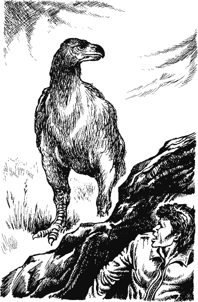 Я высунул голову и увидел гигантскую птицу — диатриму. Она была двух с половиной метров высотой, покрыта тяжелым волосовидным оперением цвета воронова крыла с медным отливом и внешне похожа на казуара. У нее были массивные ноги с четырьмя пальцами, короткая толстая шея и несуразно огромная голова с узким, как топор, хищным клювом. Но крылья ее были так малы, что терялись в оперении. Разумеется, они не могли удержать такое чудовище в воздухе. Диатрима была бегающей птицей, подобно страусу или казуару.