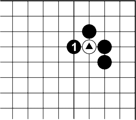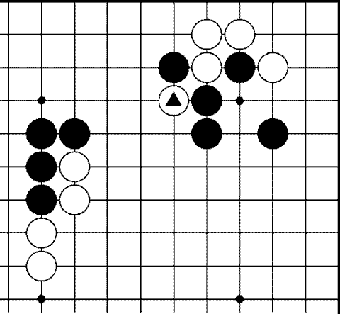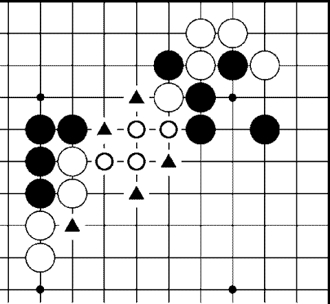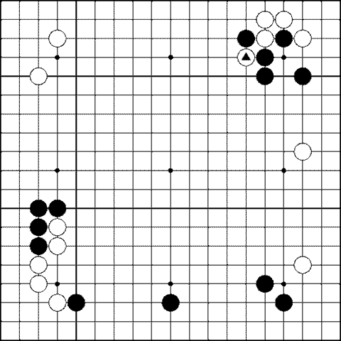 Вот позиция начала партии. Белый камень, отмеченный треугольником, разрезает черные камни. Очевидно, что сейчас ситё в пользу белых, так как на пути движения ситё в левом нижнем углу стоят только белые камни. Что же могут предпринять здесь черные?