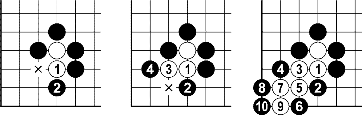 Ходом 1 черные ставят прерыватель, и сейчас белым выгодно защититься ходом 2. Ход черных 1 называется кикаси. Кика-си — это ход, на который нужно ответить. Теперь ситё завершится в пользу черных, поэтому они смело играют 3, а белые занимают большой пункт 4. Черные ходом 5 снимают разрезающий белый камень. Операция прошла успешно для черных.